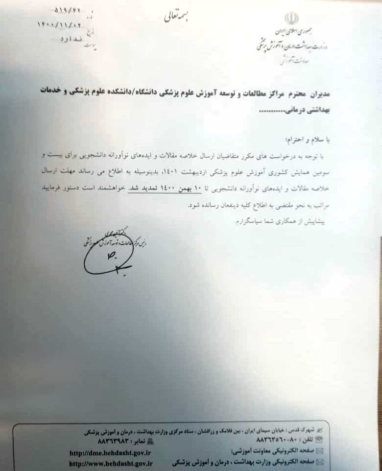 تمدید مهلت ارسال خلاصه مقالات و ایده های برتر دانشجویی در بیست و سومین همایش کشوری آموزش پزشکی 1401َ